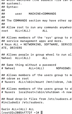 - <username> ALL=(ALL) ALL 로 해당 유저에게 root 계정의 권한이 필요한 모든 명령어 실행을 허용