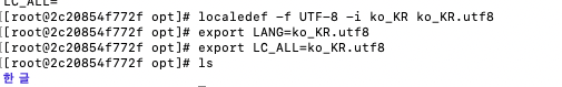[root@2c20854f772f ~]# locale -a C POSIX en_AG en_AG.utf8 en_AU en_AU.iso88591 en_AU.utf8 en_BW en_BW.iso88591 en_BW.utf8 en_CA en_CA.iso88591 en_CA.utf8 en_DK en_DK.iso88591 en_DK.utf8 en_GB en_GB.iso88591 en_GB.iso885915 en_GB.utf8 en_HK en_HK.iso88591 en_HK.utf8 en_IE en_IE.iso88591 en_IE.iso885915@euro en_IE.utf8 en_IE@euro en_IN en_IN.utf8 en_NG en_NG.utf8 en_NZ en_NZ.iso88591 en_NZ.utf8 en_PH en_PH.iso88591 en_PH.utf8 en_SG en_SG.iso88591 en_SG.utf8 en_US en_US.iso88591 en_US.iso885915 en_US.utf8 en_ZA en_ZA.iso88591 en_ZA.utf8 en_ZM en_ZM.utf8 en_ZW en_ZW.iso88591 en_ZW.utf8 ko_KR.utf8 - 하단의 명령을 순서대로 입력