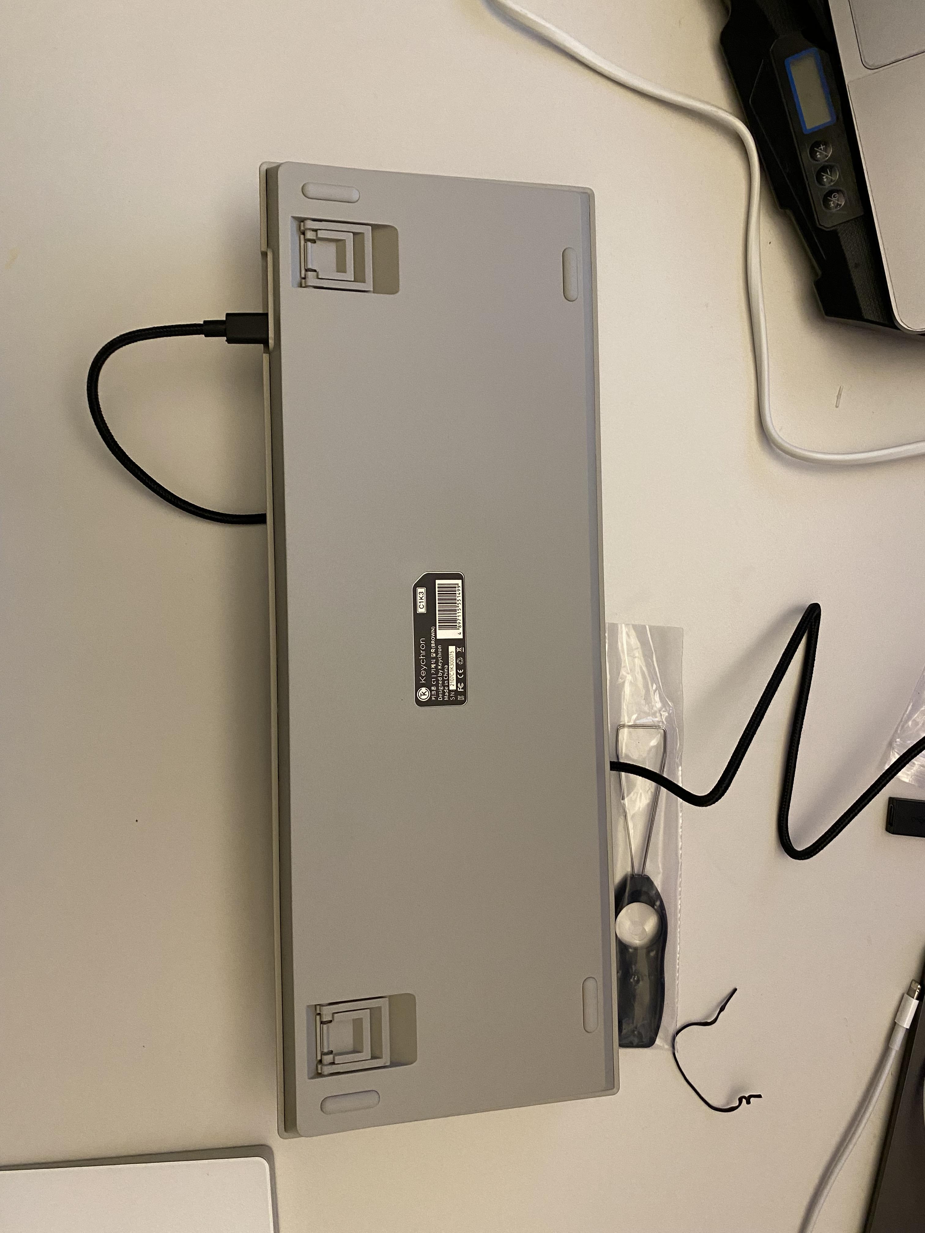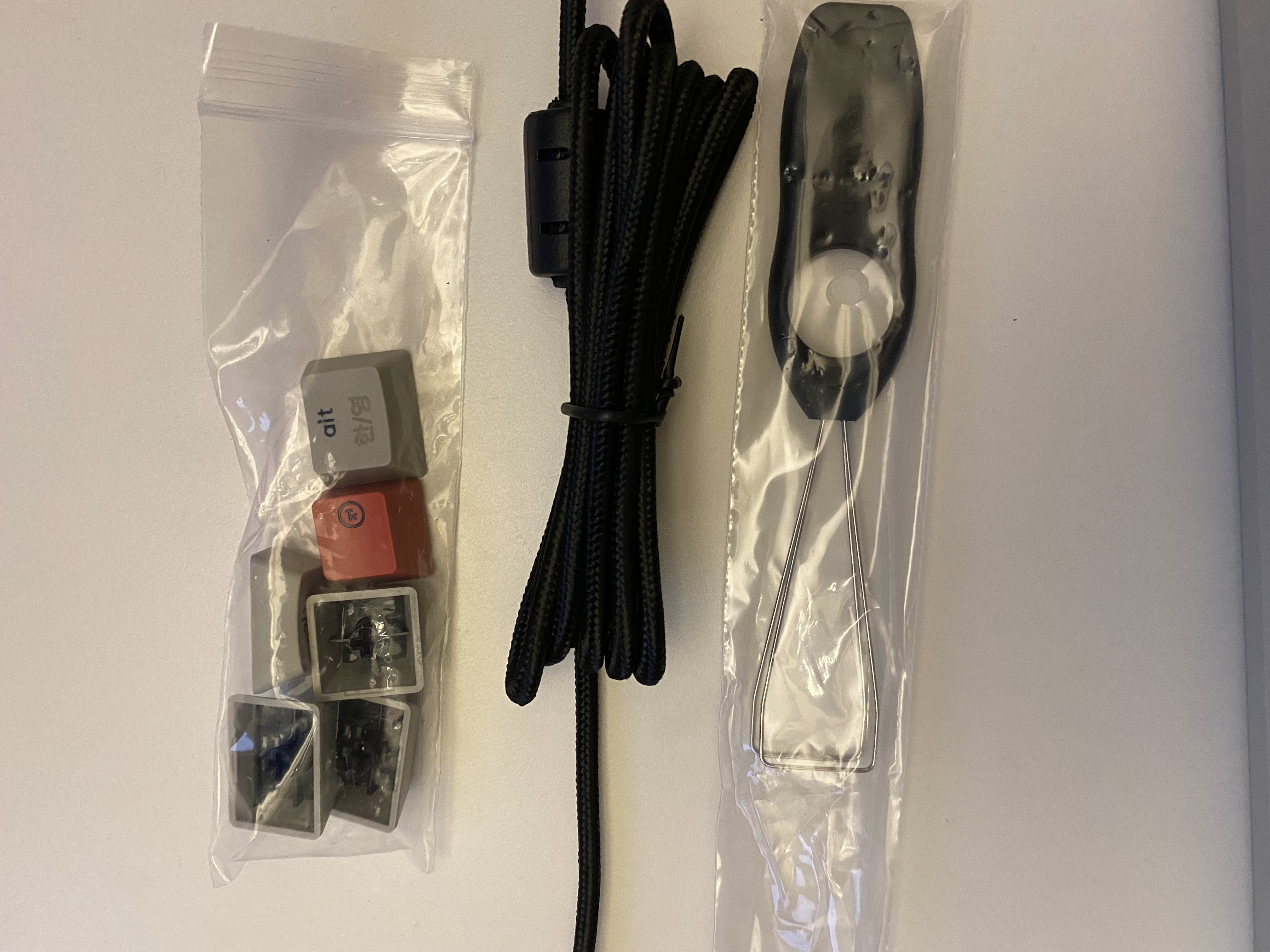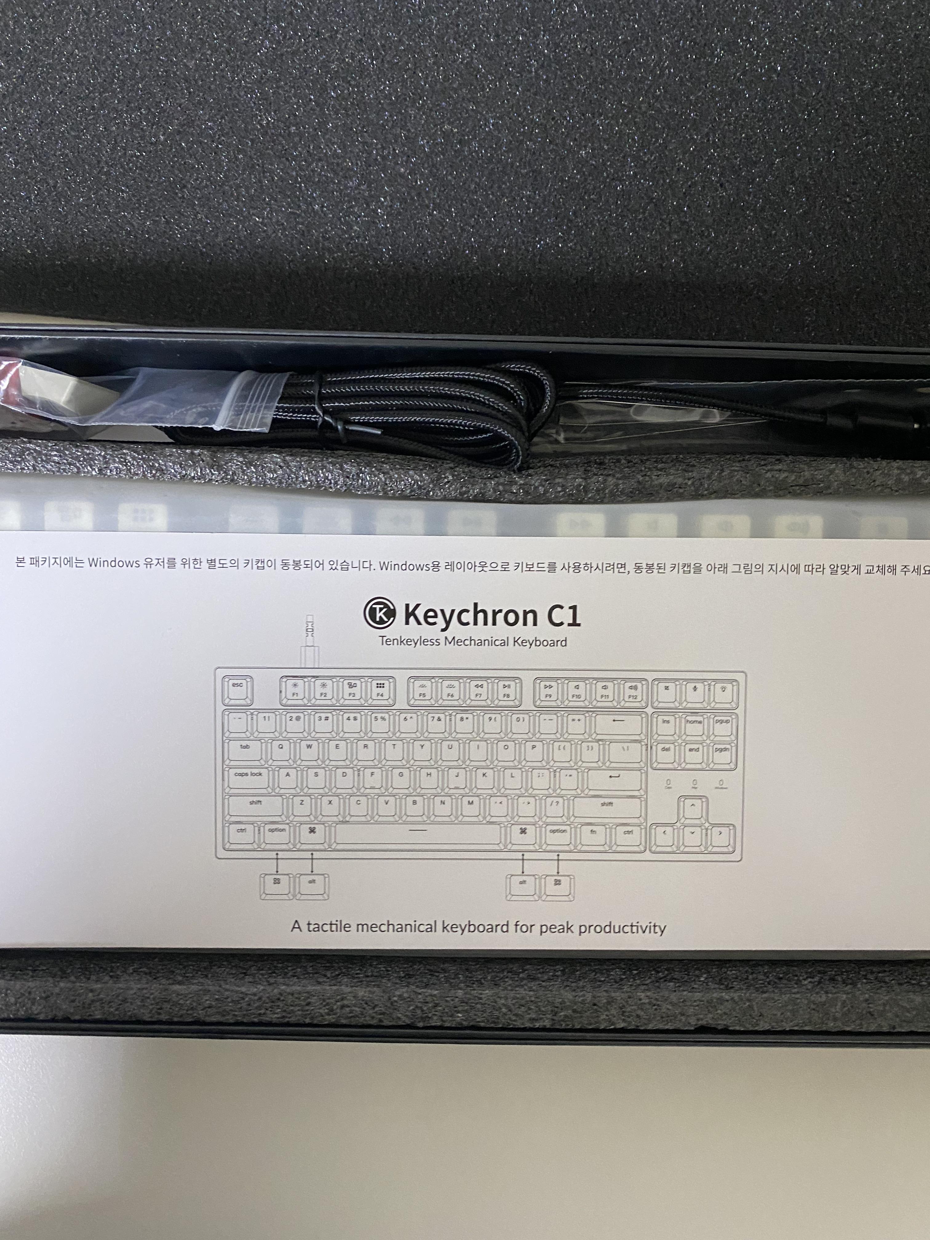 구성은 설명서, 완충용 부직포, C to C 케이블 + USB 변경 해주는 것 , 키보드, 윈도우 유저를 위한 추가 키캡, 키캡 분리하는 집게