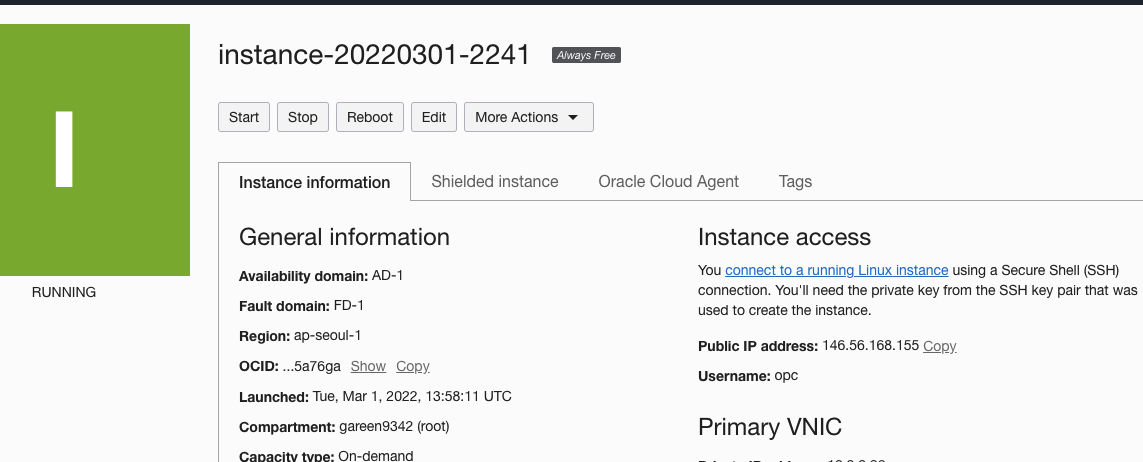 ssh opc@${ip} 를 통해 접속할 수 있다.